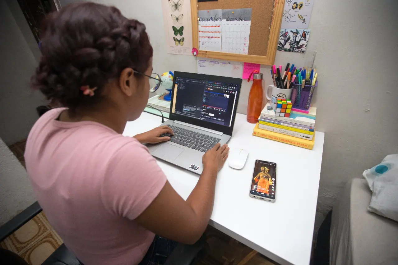 Em 2021, a mercadóloga Rokssanem Freire, de 26 anos, procurava saídas para migrar para a área de tecnologia. Ela avistou essa oportunidade em eventos e cursos do Juventude Digital (JD),