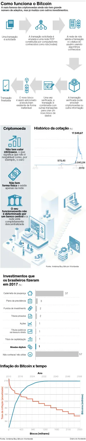 Vista como opção de alto risco para investimentos, a criptomoeda (dinheiro digital) baseia-se em um sistema de validação pelos próprios usuários, sem depender de bancos tradicionais para operar transações