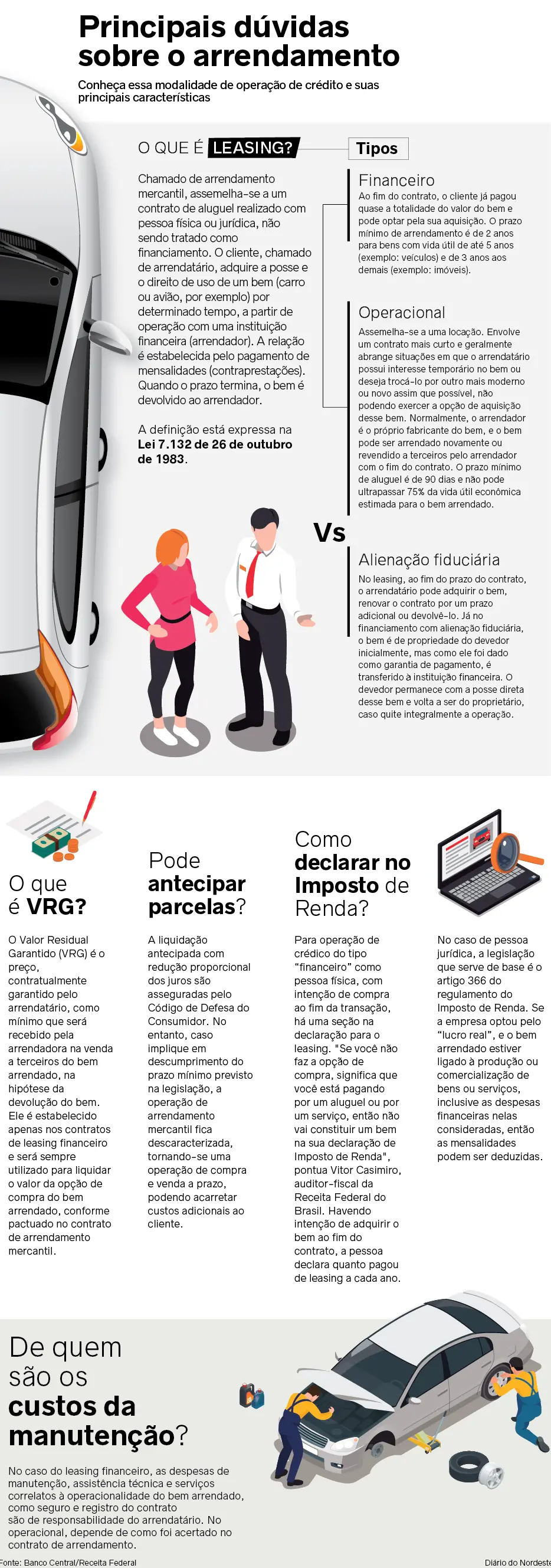 De acordo com Everton Fernandes, presidente do Sindicato dos Revendedores de Veículos Automotores do Estado do Ceará (Sindivel), entre os motivos para esse modelo de crédito não ser mais oferecido a pessoas físicas se deve à questão de não se poder antecipar as parcelas. Diferentemente do financiamento tradicional, o Crédito Direto ao Consumidor (CDC), no leasing, é obrigatório cumprir o prazo de pagamento em 24 meses previsto na legislação. "Havia muita reclamação de clientes querendo antecipar parcelas ou liquidar antes o contrato, mas não é permitido e não tem desconto se for antecipar", aponta.