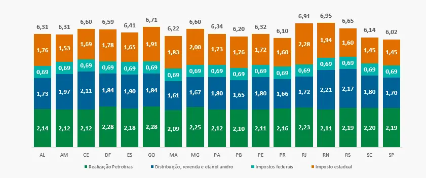 Segundo a Petrobras, no Ceará, o imposto estadual cobrado é de R$ 1,69 por litro de gasolina. Além disso, R$ 2,12 são referentes à realização Petrobras, R$ 2,11 à distribuição, revenda e etanol anidro e R$ 0,69 aos impostos federais.