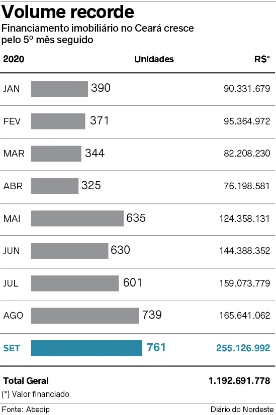 O valor representa o maior volume mensal no Ceará desde 2015. Na comparação com agosto - mês no qual o financiamento imobiliário no Estado já tinha apresentado o seu melhor resultado de 2020 com R$ 165,6 milhões -, houve crescimento de 54%. Na comparação com igual período de 2019, quando a tomada de empréstimo para a compra da casa própria totalizou R$ 99,2 milhões, o salto é ainda maior, de 156%.