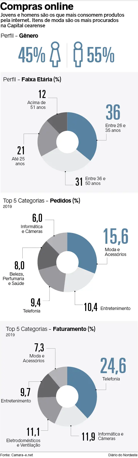 O levantamento da Camara-e.Net também apontou que Fortaleza apresentou pontos de singularidade em relação à média nacional. Segundo a pesquisa, os homens foram maioria no número de pedidos registrados na capital cearense, com 55% do total. As mulheres acabaram acumulando 45% das compras, fato que, de acordo com Brandão, apesar de surpreender, não representa uma variação muito grande. O destaque não teria uma razão específica, pois a diferença entre outras cidades analisadas "não é tão grande assim".