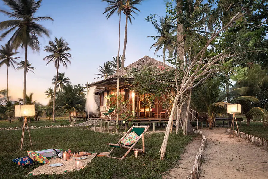 O Ceará também conta com opções para quem quer viver a experiência no litoral. Na Baía das Caraúbas, são sete bangalôs construídos em palafitas em madeira e tetos em palha.
