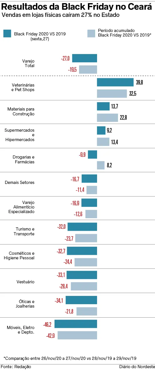 O levantamento da Cielo apontou que no dia da Black Friday de 2020, o segmento de veterinárias e petshops foi o que apresentou o melhor resultado, com uma alta de 39,8% do faturamento ante a Black Friday em 2019. Materiais para construção (13,7%), e supermercados (9,2%) foram os setores com evolução neste ano.