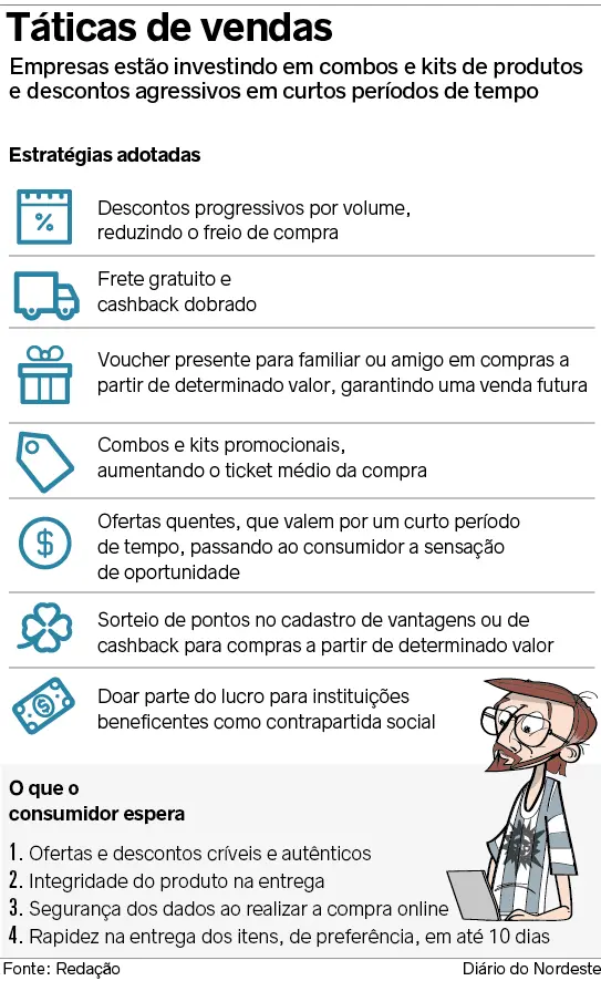 Os combos e kits promocionais também se tornaram mais comuns este ano, segundo Avesque. Ele alerta, no entanto, para também oferecer a possibilidade de adquirir os produtos isoladamente, evitando a prática de venda casada, proibida no Brasil. “É vender no cross, impressora mais notebook, sapato mais meia, aumentando o ticket médio”, explica.