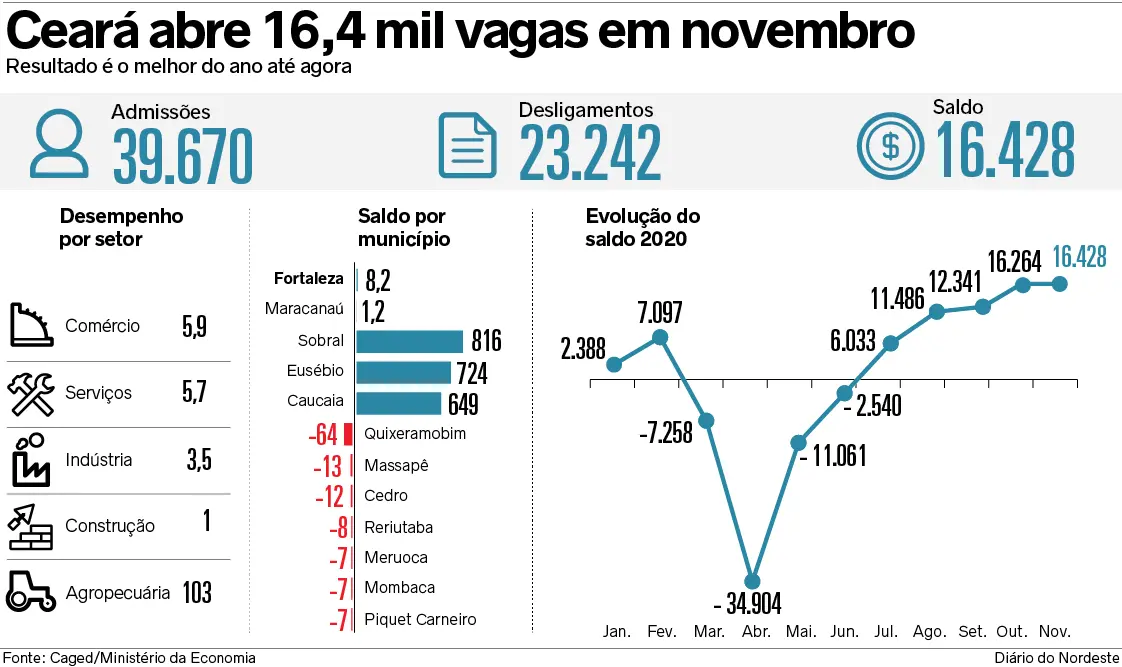 Mesmo com uma economia menor, estamos tendo mais poder de reação e de geração de empregos do que essas outras mais consolidadas", destaca. O saldo do Ceará em novembro, segundo o Caged, foi o maior do Nordeste, bem à frente da Bahia (13,8 mil) e de Pernambuco (13,8 mil), e a sétima do País, perdendo apenas para São Paulo (138,4 mil), Santa Catarina (33 mil), Minas Gerais (32,8 mil), Rio de Janeiro (32,6 mil), Paraná (29,8 mil) e Rio Grande do Sul (29,7 mil).