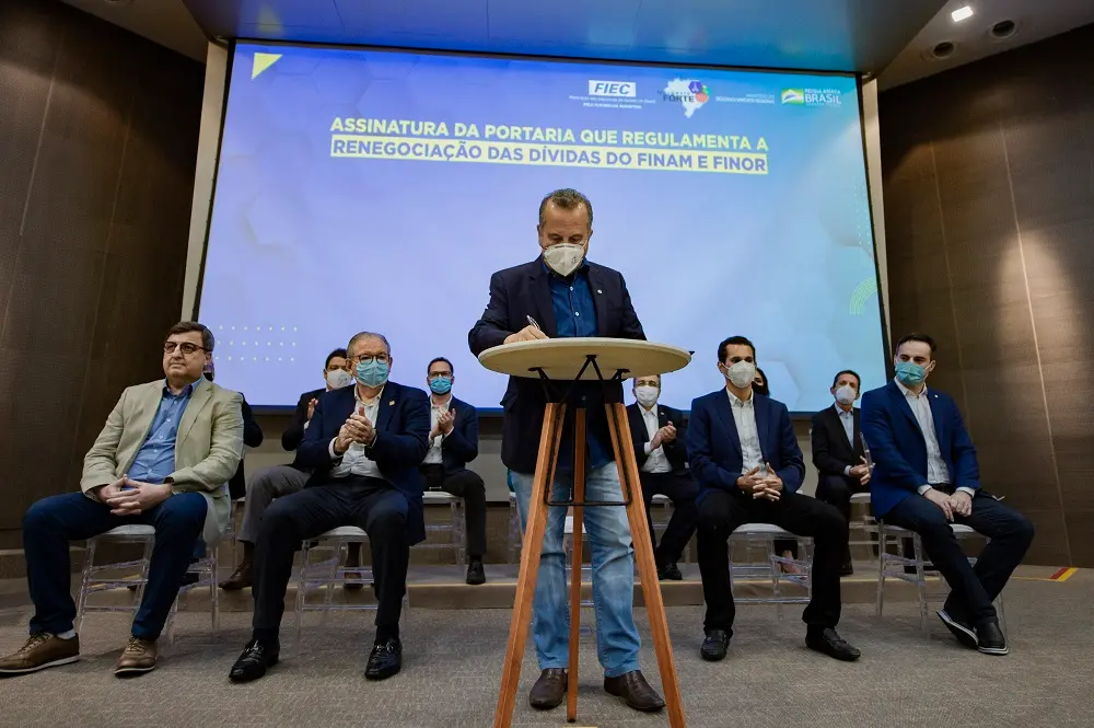 O ministro do Desenvolvimento Regional, Rogério Marinho, esteve em Fortaleza, nesta sexta-feira (30), para assinar portaria que regulamenta a renegociação das dívidas de empresas do País com o Fundo de Investimentos do Nordeste (Finor) e o Fundo de Investimentos da Amazônia (Finam). O evento ocorreu na sede da Federação das Indústrias do Estado do Ceará (Fiec).