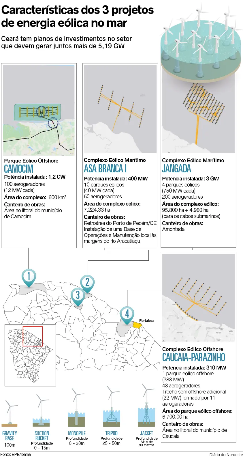 Localizado em Camocim, o complexo é o segundo projeto da BI Energia e quarto do tipo no Estado. Com 100 aerogeradores e potência instalada de 1,2 GW, projeto recebeu autorização do Ibama para elaborar estudo de impacto ambiental