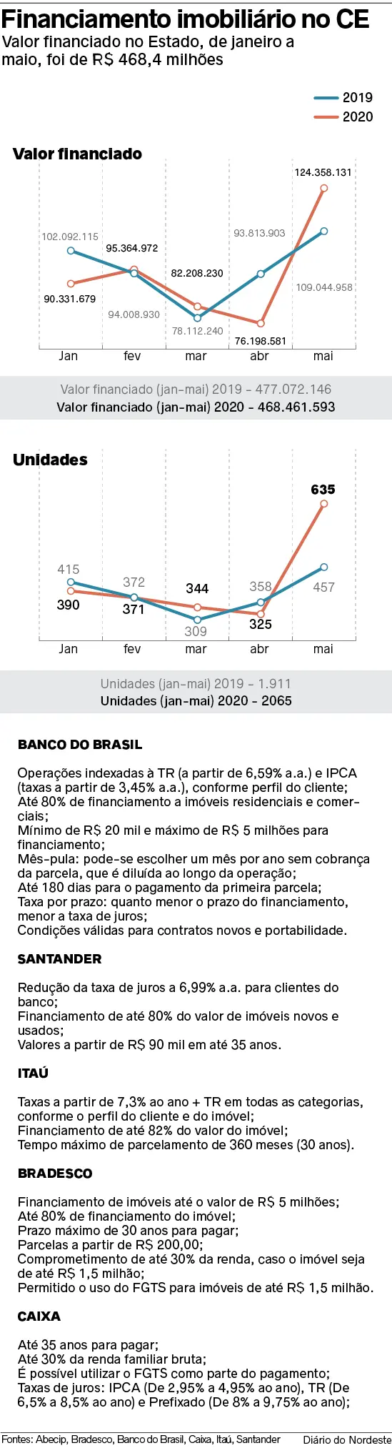 A crise provocada pela pandemia do novo coronavírus parece ter tido pouco impacto no mercado de financiamento imobiliário. Segundo a Associação Brasileira das Entidades de Crédito Imobiliário e Poupança (Abecip), foram financiados no Ceará, de janeiro a maio deste ano, 2.065 imóveis, uma alta de 8,05% na comparação com igual período de 2019. Somente no mês passado, no auge da pandemia, foram 635 unidades, um crescimento de quase 40% em relação a maio de 2019.
