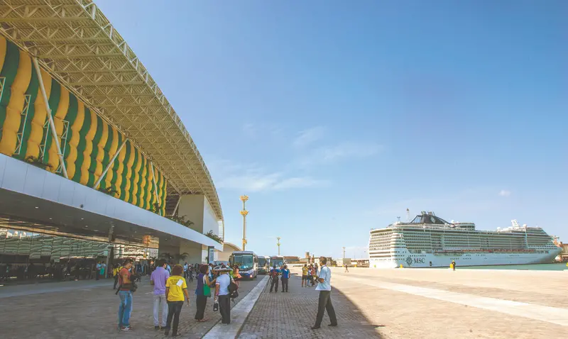 Legenda: Em junho, o navio com mexicanos que aqui vieram para assistir jogos da Copa da Fifa teve de ancorar no terminal de cargas, porque o cais de passageiros ainda não tem a profundidade necessária para grandes embarcações