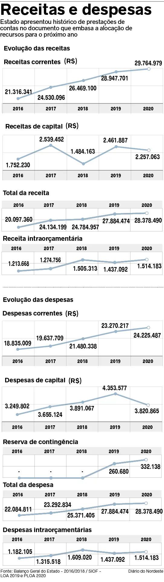 Apesar do crescimento de 1,7% previsto para o orçamento do Estado do Ceará em 2020, o volume de investimentos estimado para o próximo ano será cerca de 20% inferior ao realizado em 2019, conforme o Projeto de Lei Orçamentária Anual (PLOA) 2020, que começou a tramitar no Legislativo estadual na última quarta-feira (16). O documento prevê um orçamento de R$ 28,8 bilhões, dos quais R$ 2,6 bilhões serão destinados para investimentos voltados, principalmente, para infraestrutura.