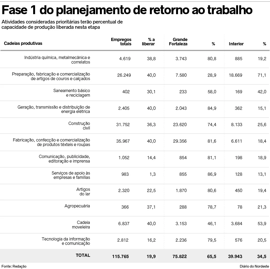 Procurado, o secretário do Desenvolvimento Econômico e Trabalho, Maia Júnior, não quis comentar sobre a escolha dos setores e os números de reativação da economia, mas afirmou que o plano de retomada está sendo finalizado e espera aprovação do governador Camilo Santana. “É nosso compromisso finalizá-lo esta semana”, disse Maia.