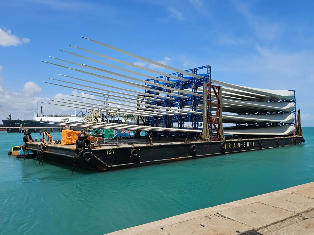 A primeira viagem das pás foi feita em uma balsa T7S, com rebocador realizando duas paradas para manutenção no trajeto de cerca de 4,5 mil quilômetros ou mais de 2 mil milhas náuticas. "A maioria das operações com balsas oceânicas no Brasil estão voltadas para o setor de óleo e gás e o setor agrícola. Essa operação é disruptiva, um marco e vai servir de referência para outras semelhantes."