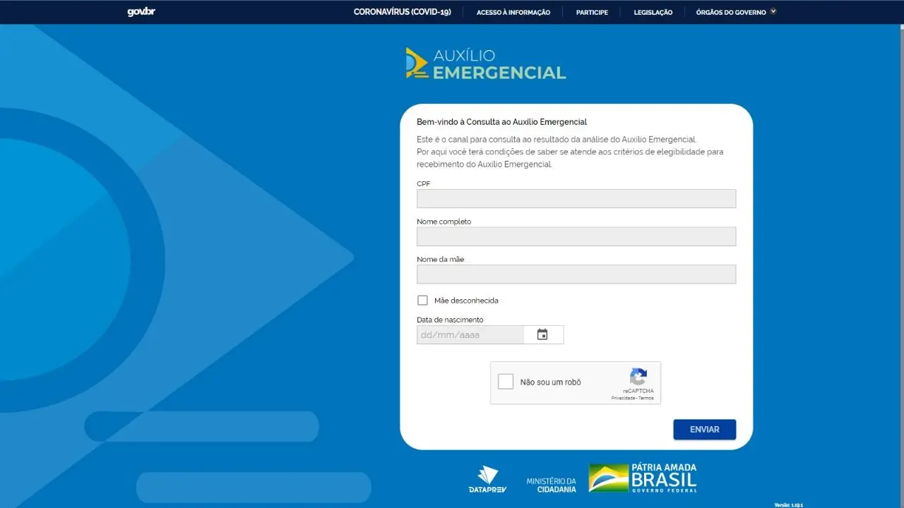 Faça a consulta do auxílio emergencial 2021 no site da Dataprev e verifique a situação. Para acessar o sistema, é preciso informar CPF, nome completo, nome da mãe e data de nascimento.