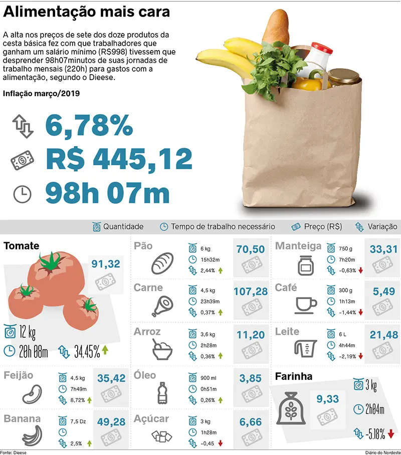A soma dos 12 produtos que compõem a cesta chegou a R$ 445,12, a mais cara entre os estados da região Nordeste. O gasto com alimentação de uma família padrão - dois adultos e duas crianças - foi de R$ 1.335,36