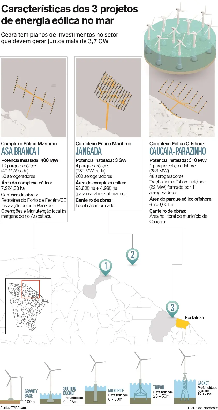 Somando os potenciais de geração de energia eólica offshore dos três projetos, o Ceará terá uma potência instalada de cerca de 3,7 GW, quase 40% de tudo (9,7 GW) que será gerado offshore no País, com os seis projetos iniciais.