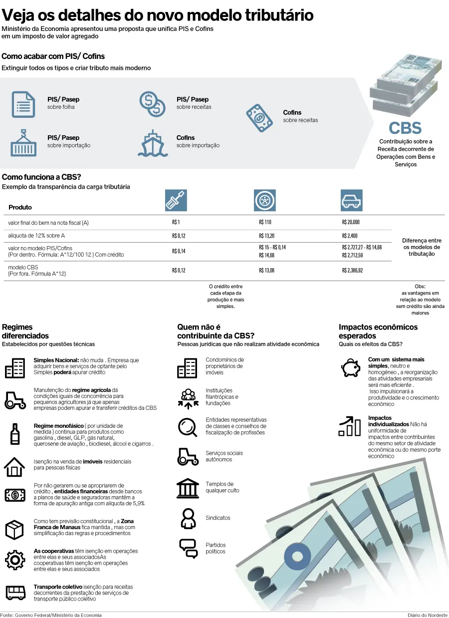 O modelo apresentado pelo Ministério da Economia trata da unificação do PIS (Programa de Integração Social) à Cofins (Contribuição para o Financiamento da Seguridade Social), passando a aplicar uma alíquota única de 12%. A proposta ainda traz uma taxa menor para entidades financeiras, incluindo bancos, planos de saúde e seguradoras (com 5,9%), e a garantia de benefícios para zonas de livre comércio.