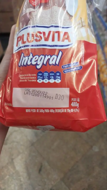 O pão integral Plusvita, da Bimbo, teve redução de 4% no peso, passando de 500g para 480g.