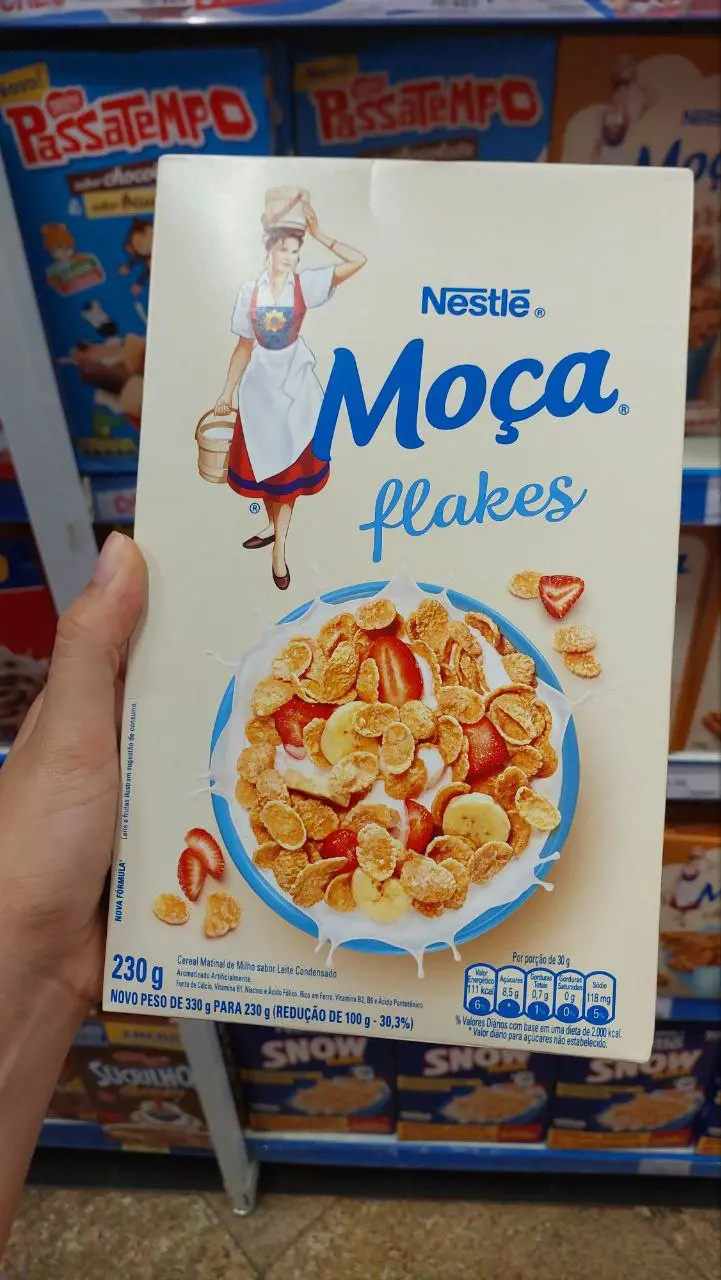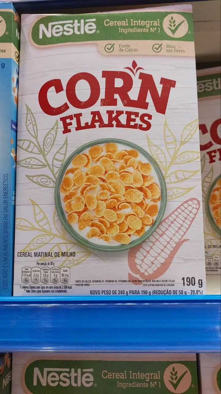O cereal matinal Moça Flakes, da Nestlé, foi o produto com maior redução percentual. A embalagem, que tinha 330g, passou a ter 230g, 100g a menos (30,3%). Outra marca da Nestlé, o Corn Flakes foi reduzido em 20,8%, de 240g para 190g.