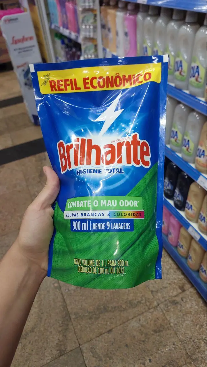 O refil do lava-roupas líquido da Brilhante teve redução de 10%, passando de 1l para 900ml.