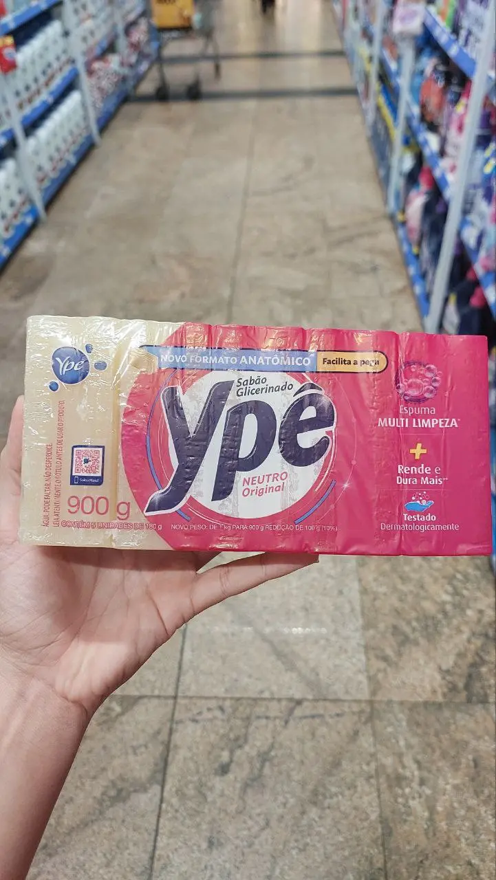 Também no corredor de produtos de limpeza, o sabão em barra da Ypê teve reduflação. A embalagem de 1kg foi reduzida em 10%, reduzida a 900g.