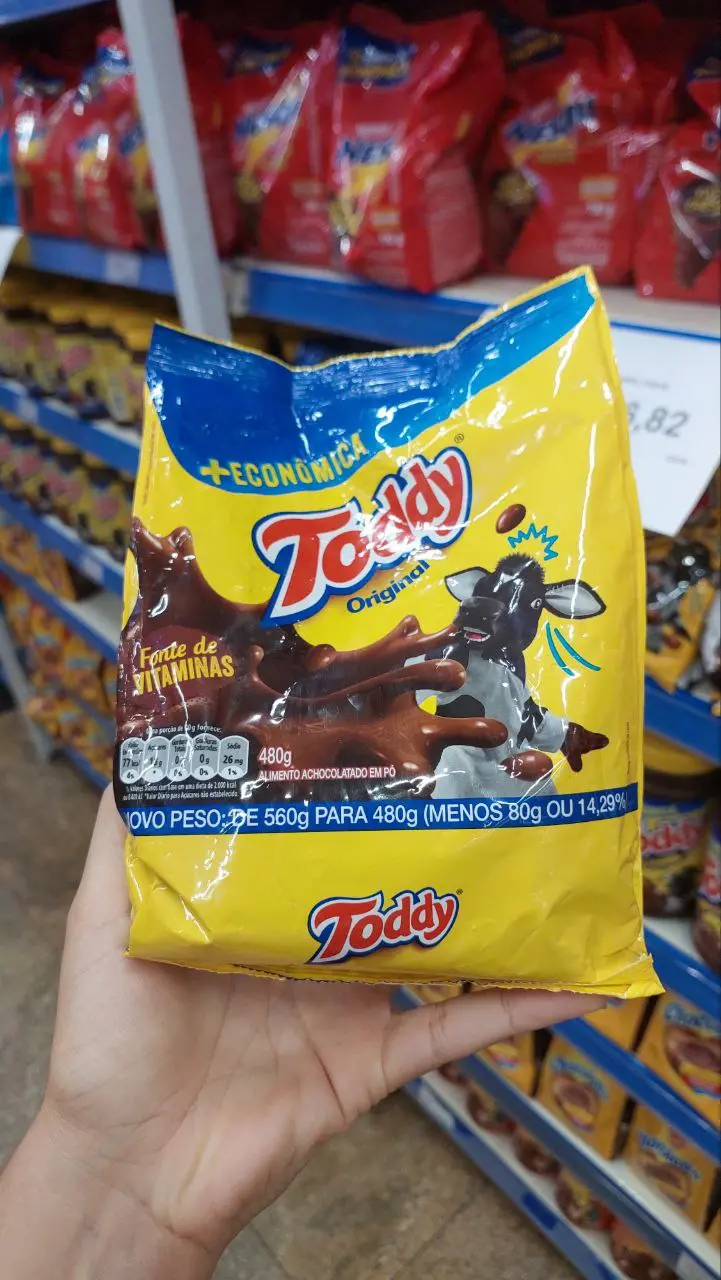 O peso do achocolatado Toddy, da Pepsico, caiu 80g, o equivalente a 14,29%. De 560g, a embalagem atual tem 480g.