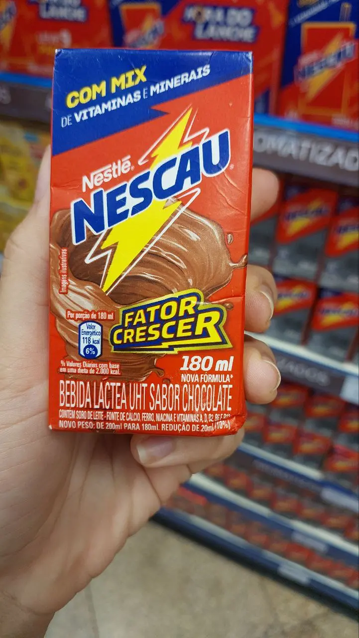 O achocolatado líquido Nescau, da Nestlé, conhecido popularmente como Nescauzinho, ficou ainda mais "inho". A embalagem teve redução de 10%, de 200ml para 180ml.