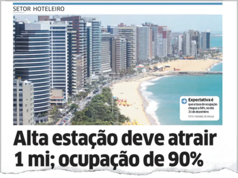 A Secretaria de Turismo do Ceará (Setur) prevê a vinda de 1 milhão e 15 mil turistas para Fortaleza neste período de alta estação - de dezembro deste ano a fevereiro próximo. A expectativa da pasta é que as visitas resultem em receita turística de R$ 1,88 bilhão, totalizando renda de R$ 3,29 bilhão para o Estado.
