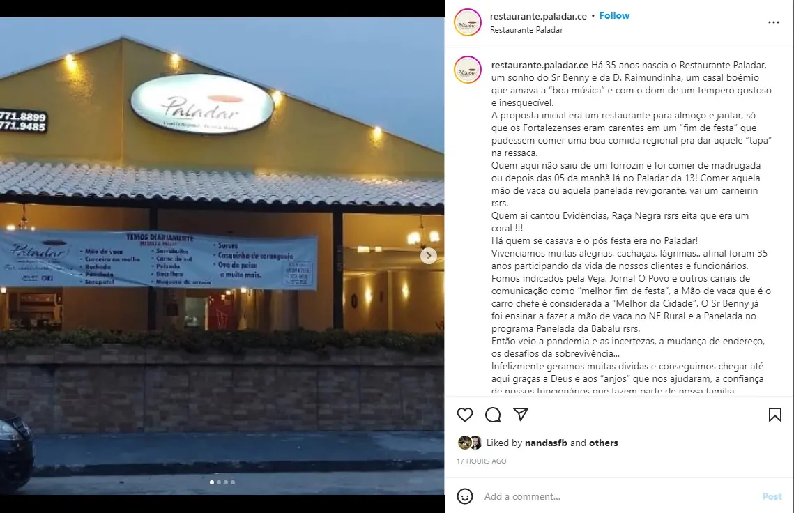 "Vivenciamos muitas alegrias, cachaças, lágrimas. Afinal foram 35 anos participando da vida de nossos clientes e funcionários. O Sr Benny já foi ensinar a fazer a mão de vaca no NE Rural. Então veio a pandemia e as incertezas, a mudança de endereço, os desafios da sobrevivência", diz o post.