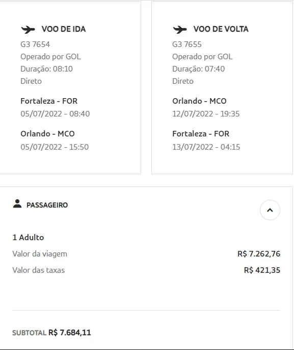 O trecho de volta é indicado nos mesmos dias, saindo de Orlando às 19h35 e chegando em Fortaleza às 4h15 do dia seguinte.