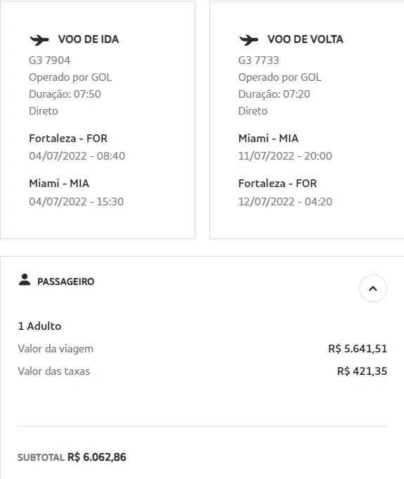 O valor cobrando pela empresa para uma passagem com ida em 4 de julho e volta em 12 do mesmo mês é de R$ 6.062,86.
