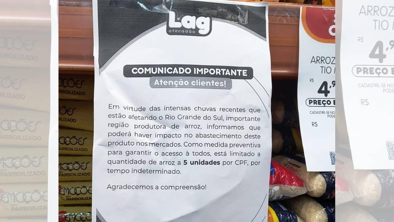 "Em virtude das intensas chuvas recentes que estão afetando o Rio Grande do Sul, importante região produtora de arroz, informamos que poderá haver impacto no abastecimento deste produto nos mercados. Como medida preventiva para garantir o acesso a todos, está limitada a quantidade de arroz a 5 unidades por CPF, por tempo indeterminado", informa o comunicado na prateleira do Atacadão Lag, no Mondubim. A restrição, no entanto, vale apenas para uma marca.