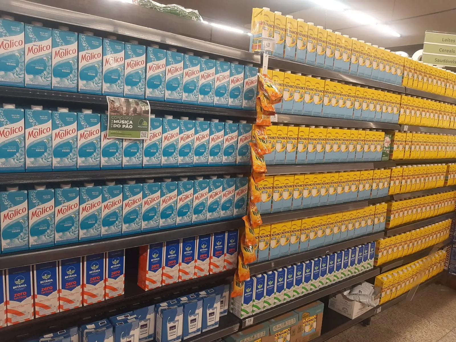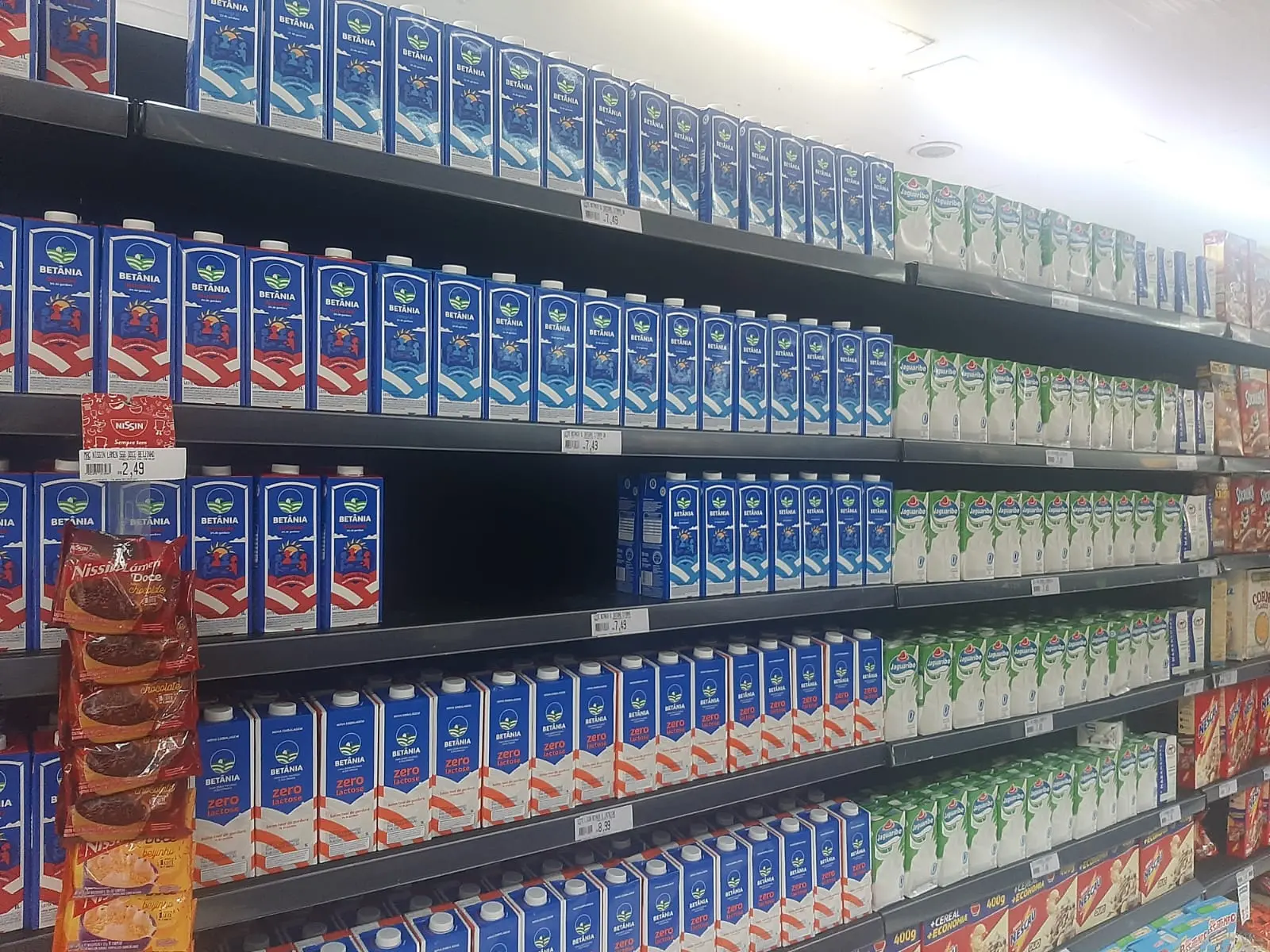 O preço na loja variava entre R$ 7,15 chegava a até R$ 10,39 no caso da marca Molico, sem lactose. De acordo com funcionário, o leite integral estava em falta há duas semanas.