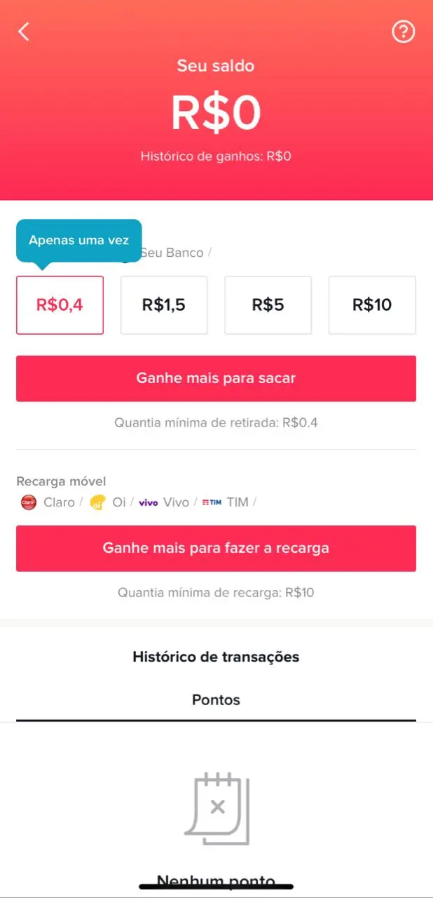 - Depois pressione o botão ‘Sacar’. Os saques são disponibilizados em diferentes valores: R$ 0,40 (para a primeira transação); R$ 1,5; R$ 5; e R$ 10;