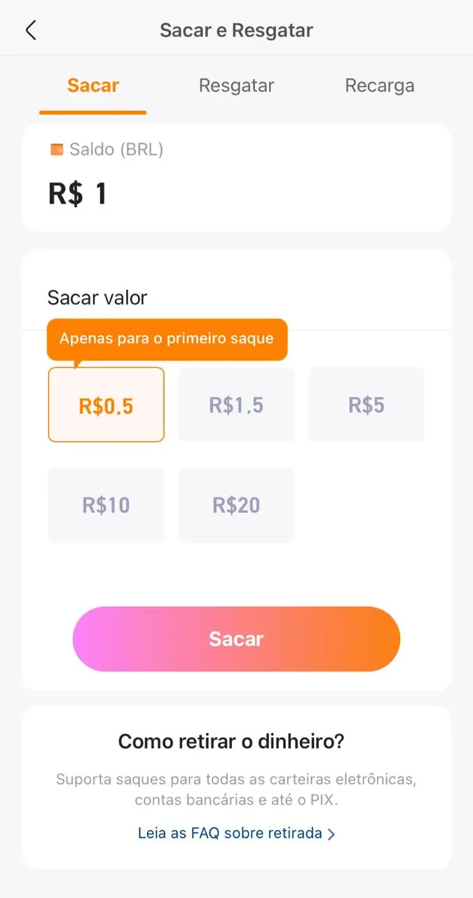 - Clique no saldo e depois em ‘Sacar’. Os saques são disponibilizados em diferentes valores: R$ 0,50 (para a primeira transação); R$ 1,5; R$ 5; R$ 10 e R$ 20;