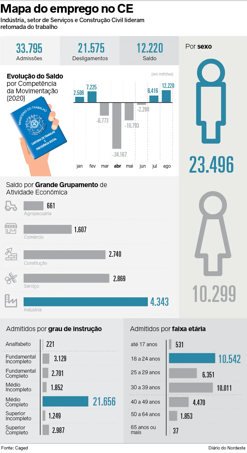 O crescimento pelo segundo mês seguido do mercado de trabalho no Ceará foi propagado por todos os segmentos da economia local. Segundo dados do Cadastro Geral de Empregados e Desempregados (Caged), em agosto, foram criados 12,22 mil novos postos de trabalho com carteira assinada no Estado, mais que o dobro do resultado do mês anterior (5,7 mil).