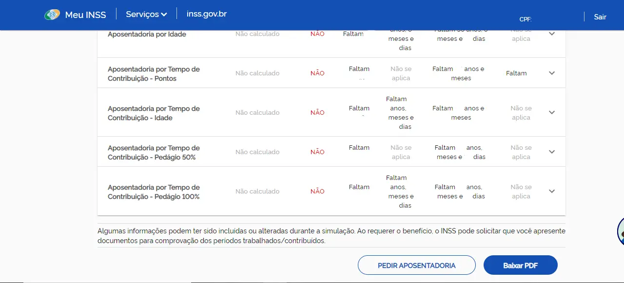 5º passo: a partir do resultado, você pode clicar em “pedir aposentadoria” ou “baixar PDF” na parte inferior da página.