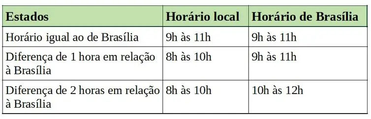 Nas demais unidades da Federação, das 8h às 10h e das 9h às 11h (horário local).