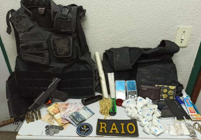 Policiais conseguiram apreender uma arma de fogo, munições, carregadores, drogas e coletes balísticos. Suspeitos fugiram