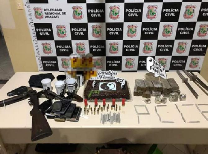 Agentes apreenderam armas, drogas e itens para festa como bolo e copos personalizados