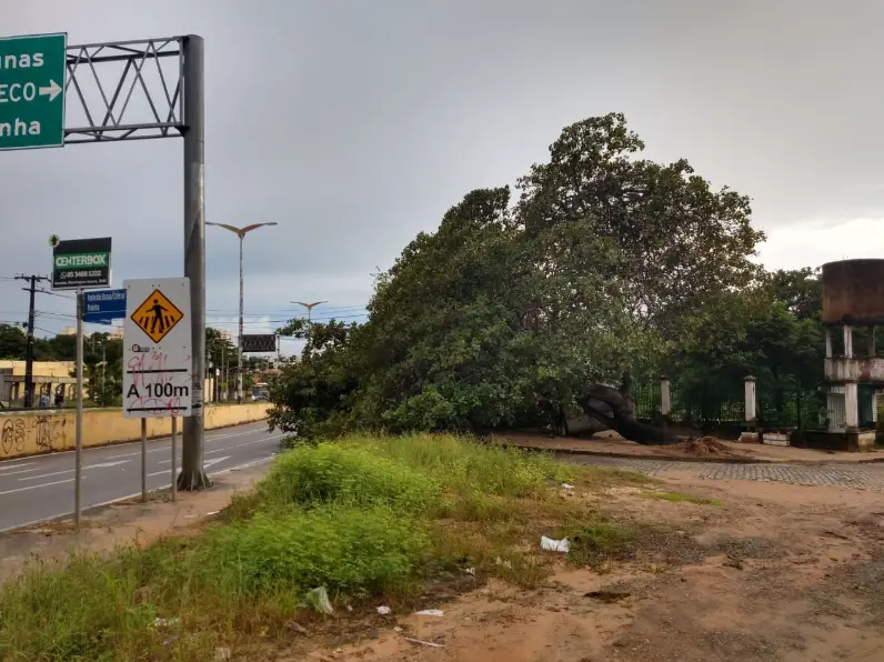 Parte do muro desabou no Bairro Vicente Pinzon. E um cajueiro caiu e bloqueia parte da Avenida Washington Soares.