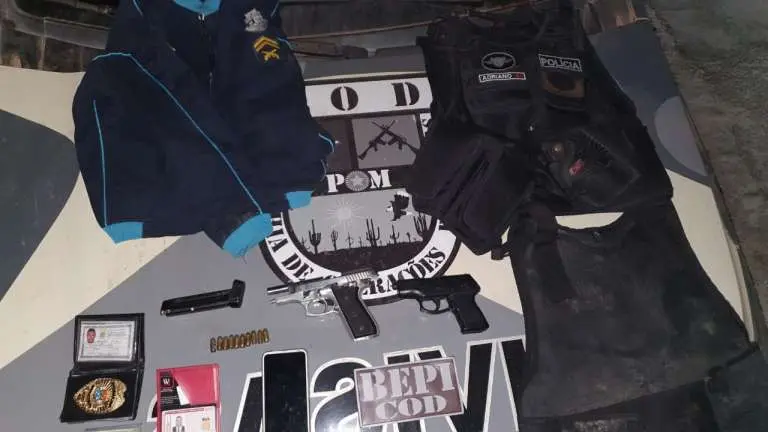 A polícia apreendeu com ele uma farda da Polícia Militar do Ceará (PMCE), uma carteira da Ordem dos Advogados do Brasil (OAB) e um colete balístico