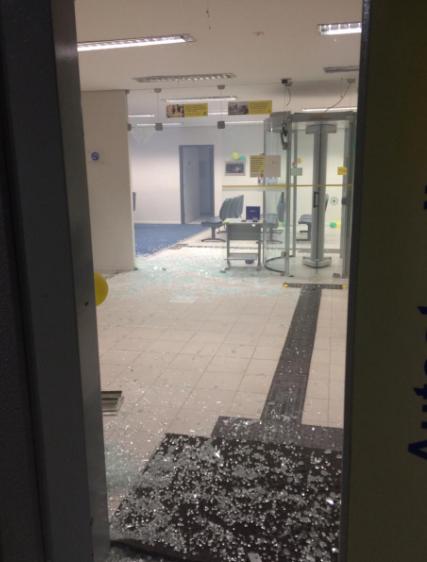 Grupo entrou na agência utilizando uma picareta para quebrar a porta de vidro