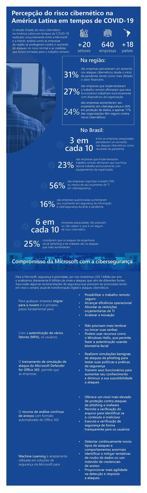 O estudo, realizado em conjunto entre a Marsh, líder em consultoria, corretagem de seguros e gerenciamento de riscos, e a Microsoft, analisa como as empresas se protegeram de ataques crescentes no novo normal e as medidas que foram tomadas para o trabalho remoto.