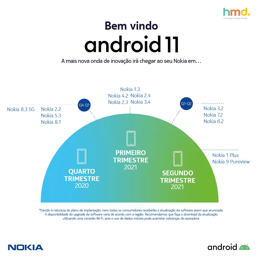 Na liderança em atualizações do sistema operacional Android, a HMD Global, fabricante dos telefones Nokia, revelou quando os aparelhos da marca receberão a versão 11 do sistema operacional do Google. O cronograma está planejado para começar no quarto trimestre de 2020 com o novo Nokia 8.3 5G e o Nokia 5.3. Comprovando o compromisso da empresa em fornecer suporte igual aos smartphones em todo o portfólio, independentemente dos preços e datas de lançamento, os proprietários do Nokia 2.2 e Nokia 8.1 também estarão entre os primeiros a experimentar o Android 11 ainda em 2020. Já o Nokia 2.3, smartphone lançado no Brasil em maio deste ano e que marcou o retorno da marca ao País, receberá a atualização para o Android 11 a partir do primeiro trimestre de 2021.