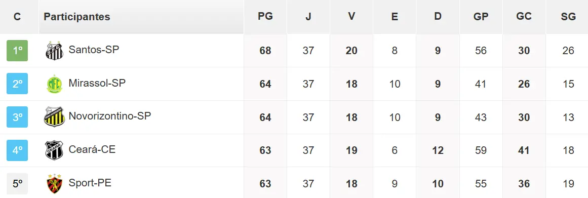 Vale ressaltar que, matematicamente, apenas o campeão Santos subiu de divisão. A briga final está entre Ceará, Sport, Mirassol e Novorizontino.