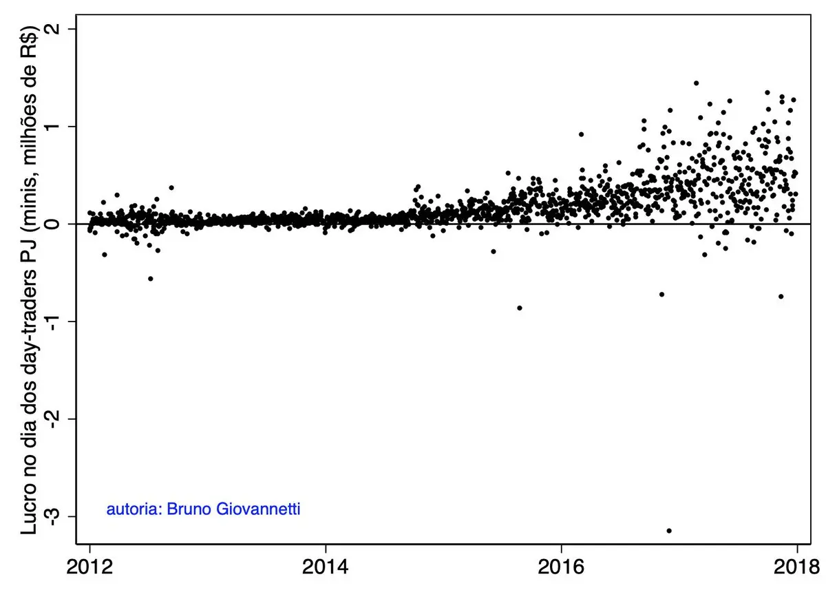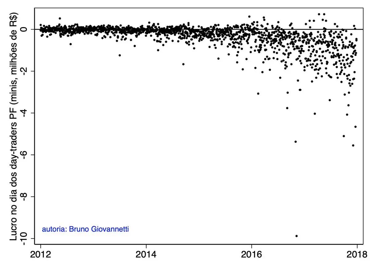 Outro artigo publicado, agora sob a ótica de day trade em ações no mercado à vista, segundo os mesmos autores, dos 98.378 indivíduos que fizeram sua primeira operação no período entre 2013 e 2016, apenas 554 ficaram em mais de 300 pregões. Todos os outros indivíduos (99,4%) não persistiram na atividade.