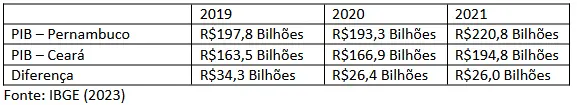 Mantida a evolução dos PIBs, e fazendo projeções com base no ritmo de crescimento de 2019 a 2021, a economia cearense poderá superar a pernambucana ainda em menor tempo, em pouco mais de 5 anos.