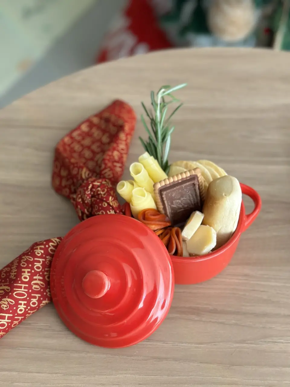 Seja num café da manhã ou almoço, a proposta da panela de porcelana é uma boa pedida. Sem muito mistério, a ideia aqui é preencher a peça com itens deliciosos e que harmonizem no paladar: pão, queijo, torradas, biscoito de chocolate, pepperoni e toque de alecrim para colorir. O toque temático ficou por conta do guardanapo de tecido amarrado na alça da mini panela. Puro charme!