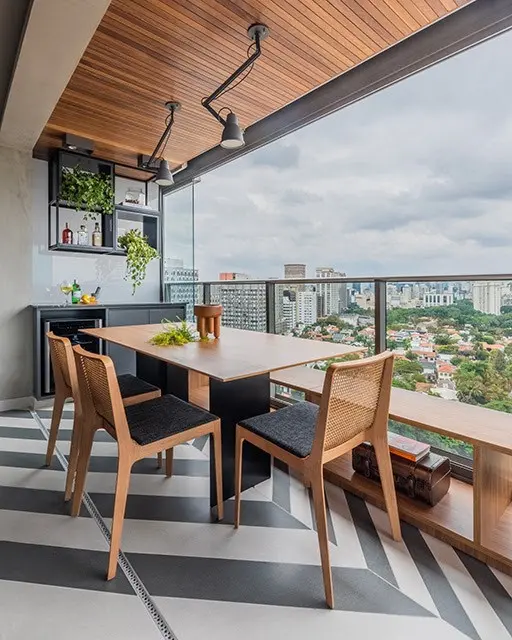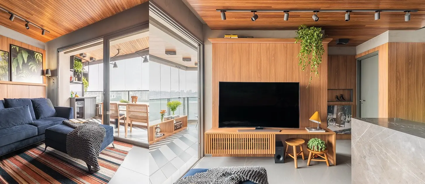 Lembram da quinta parede? Olha ela aí também em destaque com madeira cumaru. Esse efeito decorativo no teto é uma estratégia para criar uma unidade nos ambientes reforçando a integração. O amadeirado também tem o poder de promover a sensação de acolhimento nos espaços.